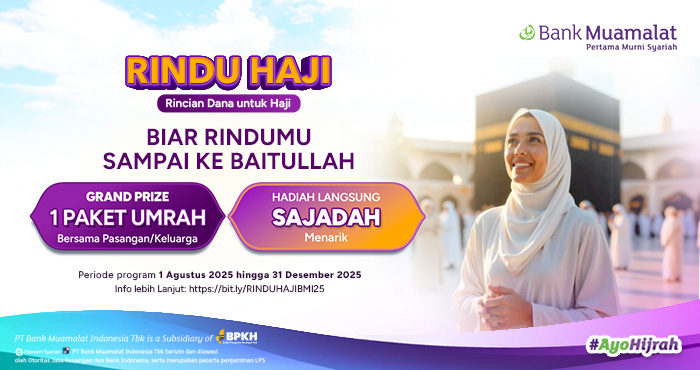 | PT Bank Muamalat Indonesia Tbk berizin dan diawasi oleh Otoritas Jasa Keuangan (OJK), Bank Indonesia (BI), serta merupakan peserta penjaminan Lembaga Penjamin Simpanan (LPS). |